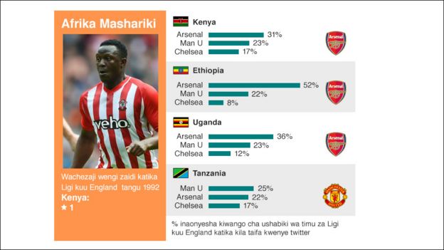 Chaguo la wengi katika eneo la Afrika Mashariki ni rangi nyekundu ya Arsenal. Umaarufu mkubwa zaidi wa the Gunners katika eneo hili unaweza kuwa ulitokana na dhana ya kuwa timu 'isiyoweza kushindwa', baada ya timu hiyo kuvunja rekodi katika msimu wa mwaka 2003-04 kwa kunyakuwa ligi bila kupoteza mechi yoyote, ilicheza mechi 49 bila kupoteza yoyote.